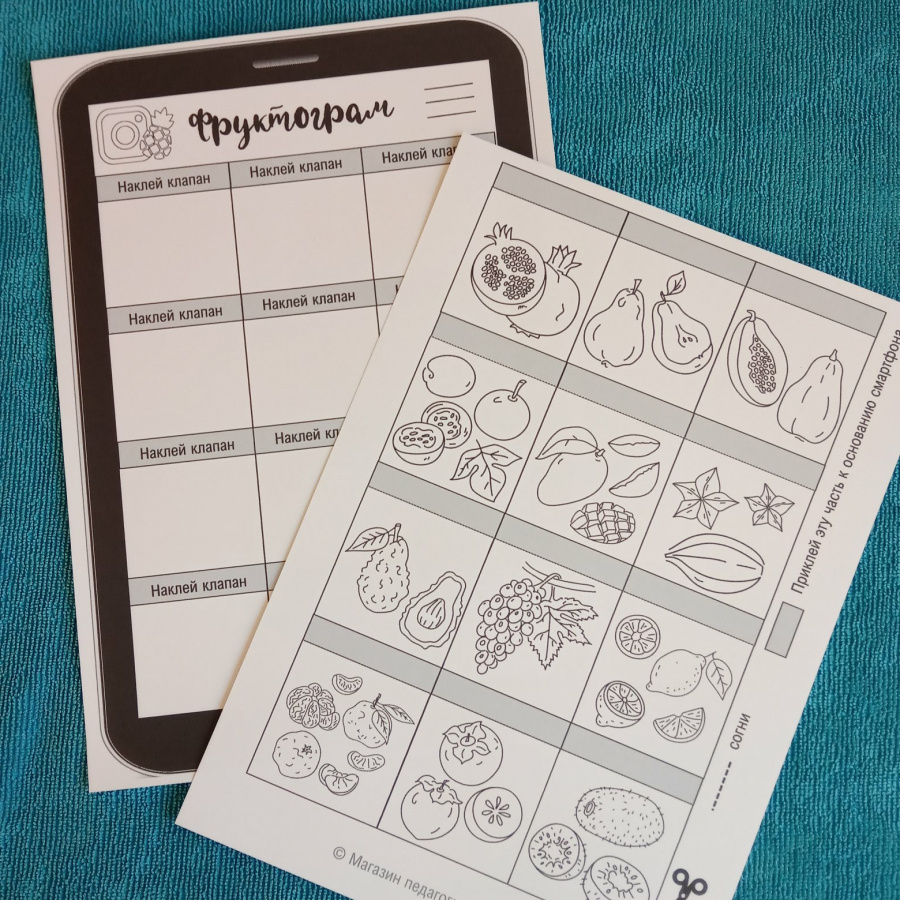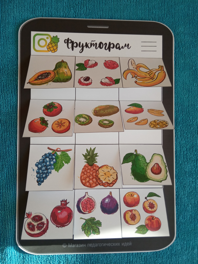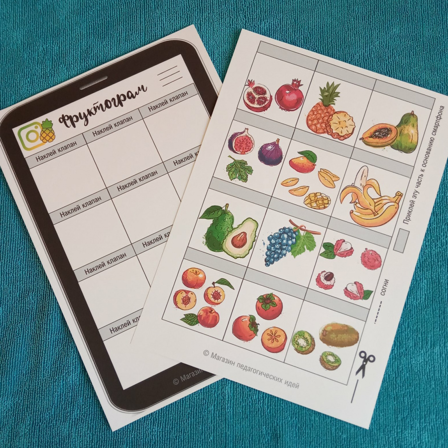 Есть и шаблон, с помощью которого можно зафиксировать информацию о 12 фруктах. Это шаблон с клапанами (контурные рисунки для раскрашивания, цветные изображения, пустые клапаны для свободного творчества), где под клапанами можно написать краткую выжимку - самое-самое о каждом фрукте.
