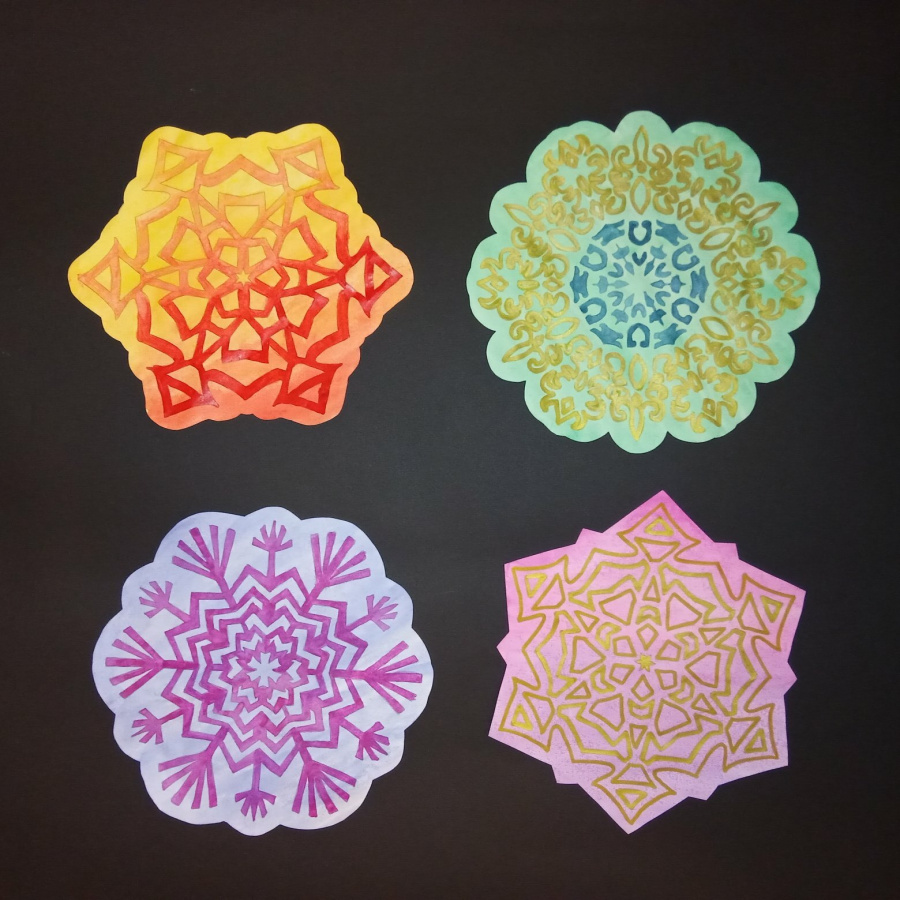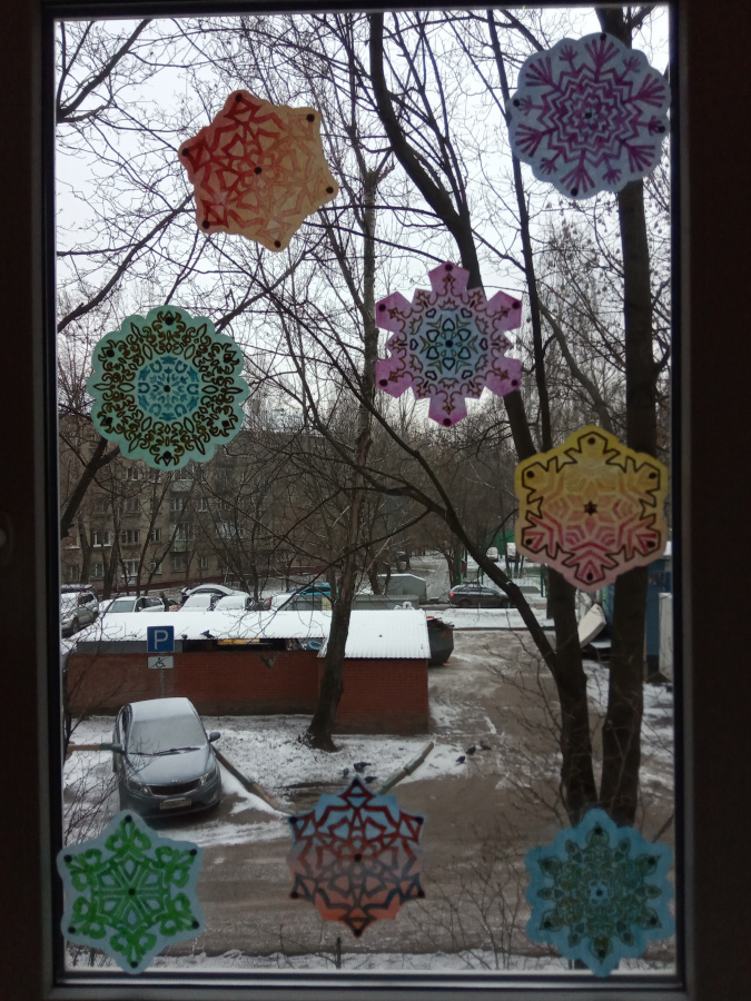 Эти снежинки универсальны: они подходят для декора окон в стиле пропускающих свет витражей; ими можно украшать двери, пробковые доски; из них можно собирать сердца, снежные вихри и елки на стенах (в классе, коридоре, рекреации); собирать гирлянды и крепить к потолку на спиральных бумажных лентах, имитируя снегопад - все, что угодно в одном комплекте!