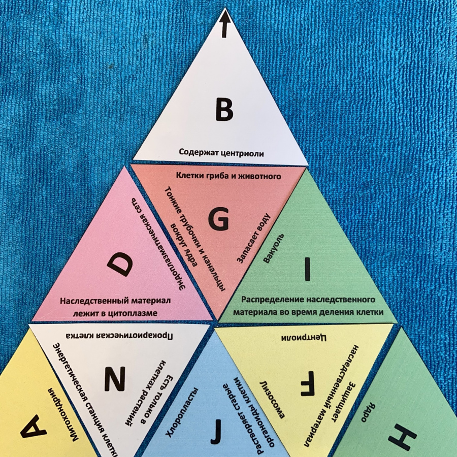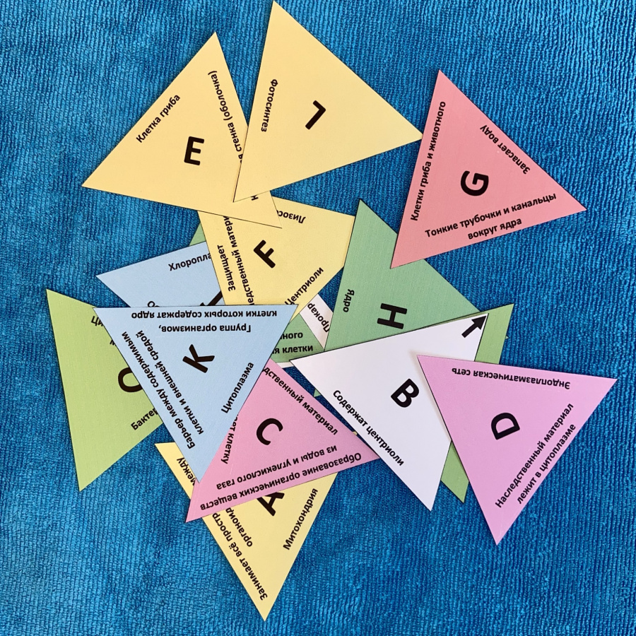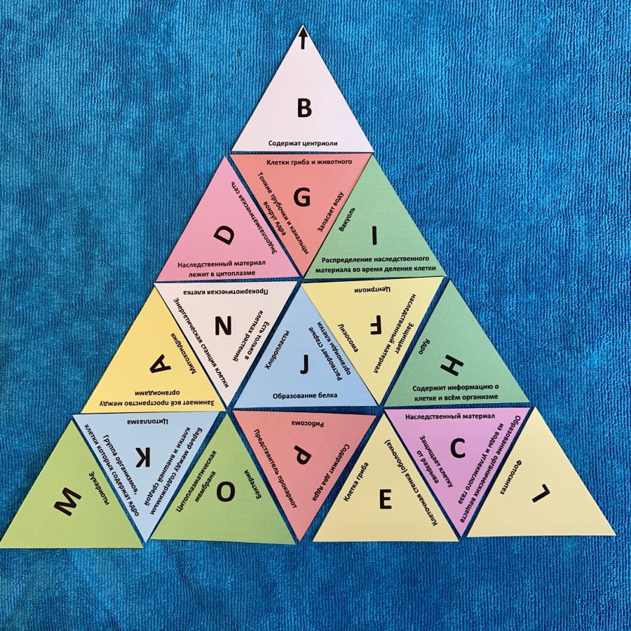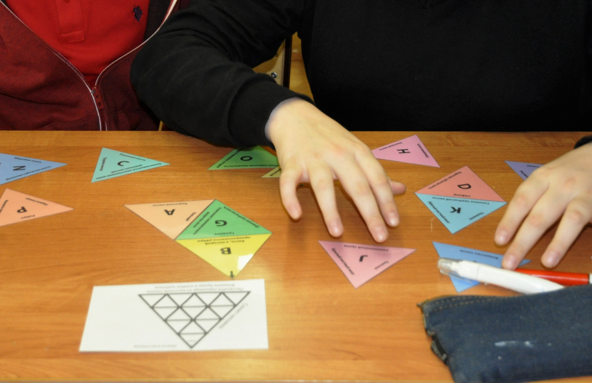Триамино - это вариант задания на соответствие, в результате выполнения которого складывается большой треугольник из маленьких треугольников. При этом вопрос и ответ должны оказаться на соприкасающихся гранях соседних треугольников. В комплект входит шаблон треугольника, в который можно вписать ответы (латинские буквы на треугольниках), а так же ответы, чтобы можно было быстро проверить результат.