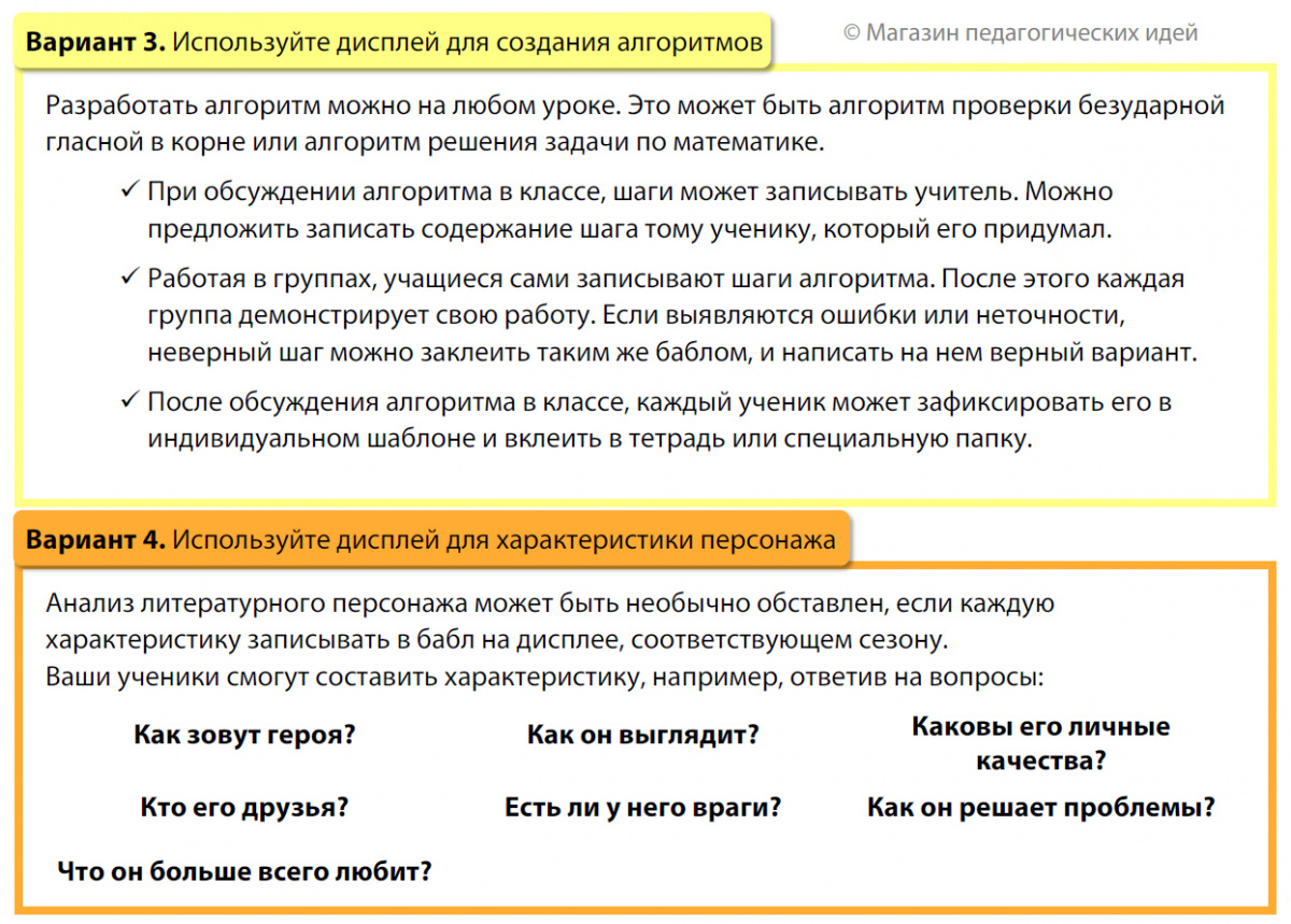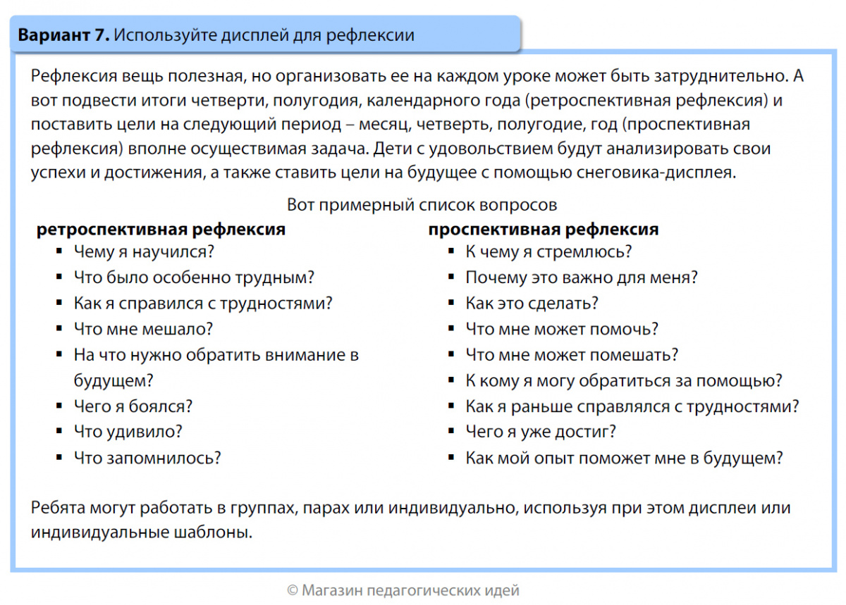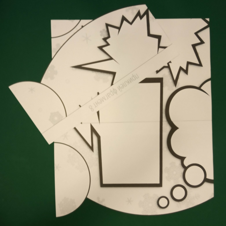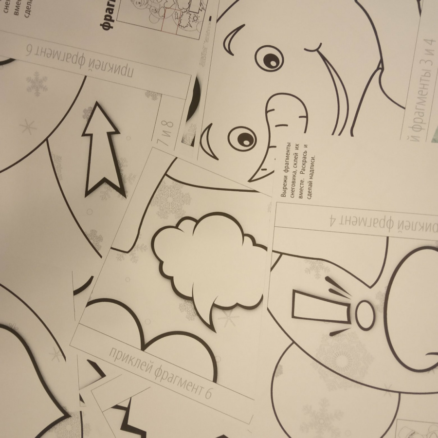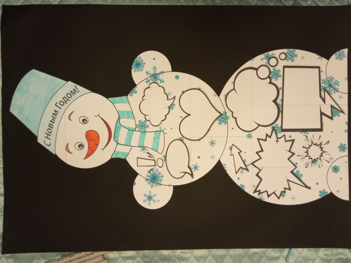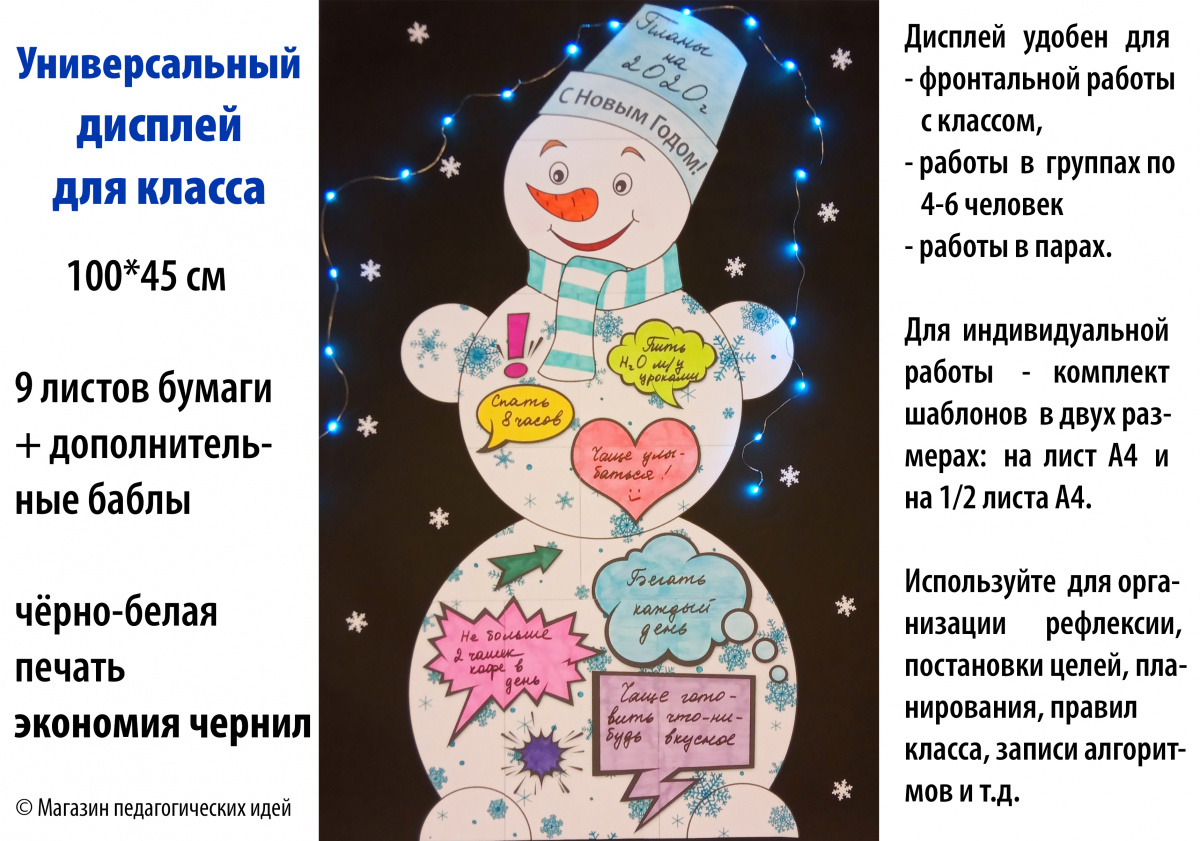 Большой дисплей-снеговик как раз такое решение. Он большой - метр в высоту. На нем есть специальные места - баблы, как в комиксах- для надписей. Его можно собирать, раскрашивать и заполнять всем классом, в группах или парах. Есть баблы на отдельных листах, чтобы если что-то пошло не так, можно было их распечатать, вырезать и наклеить на испорченное место дисплея.