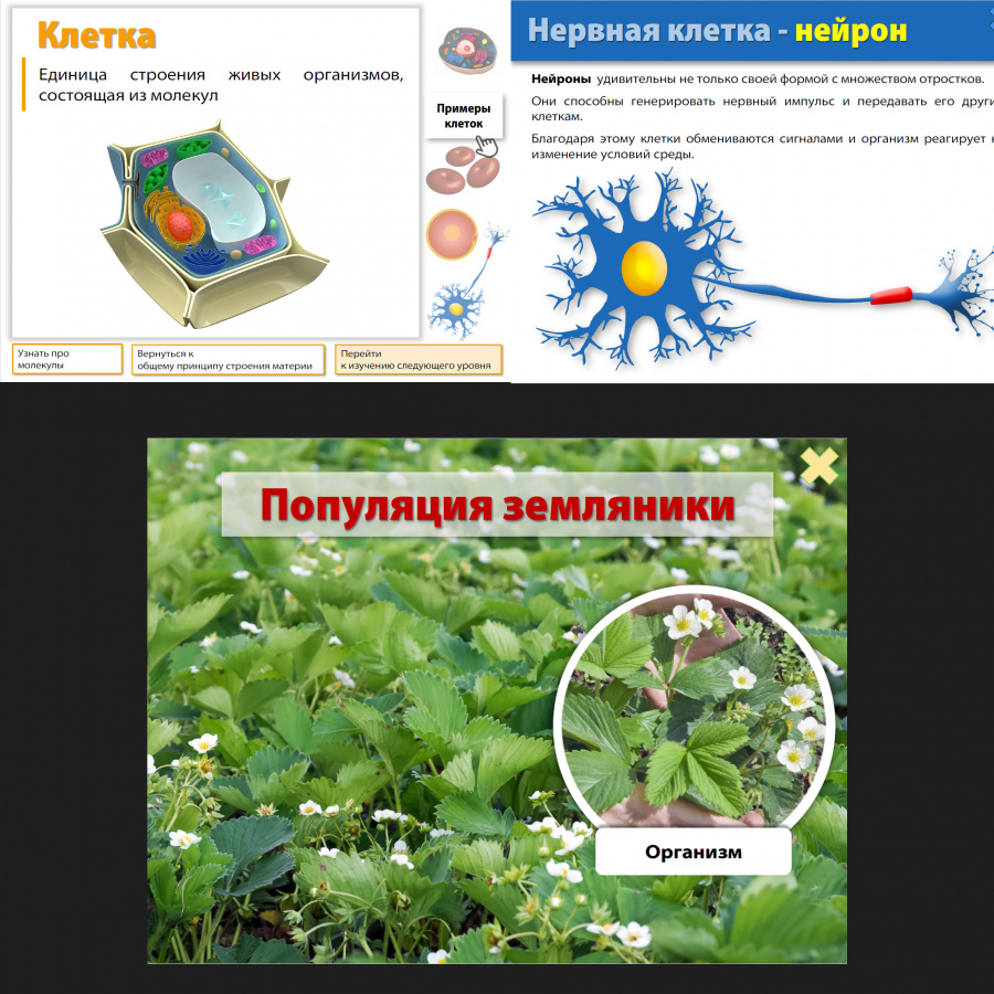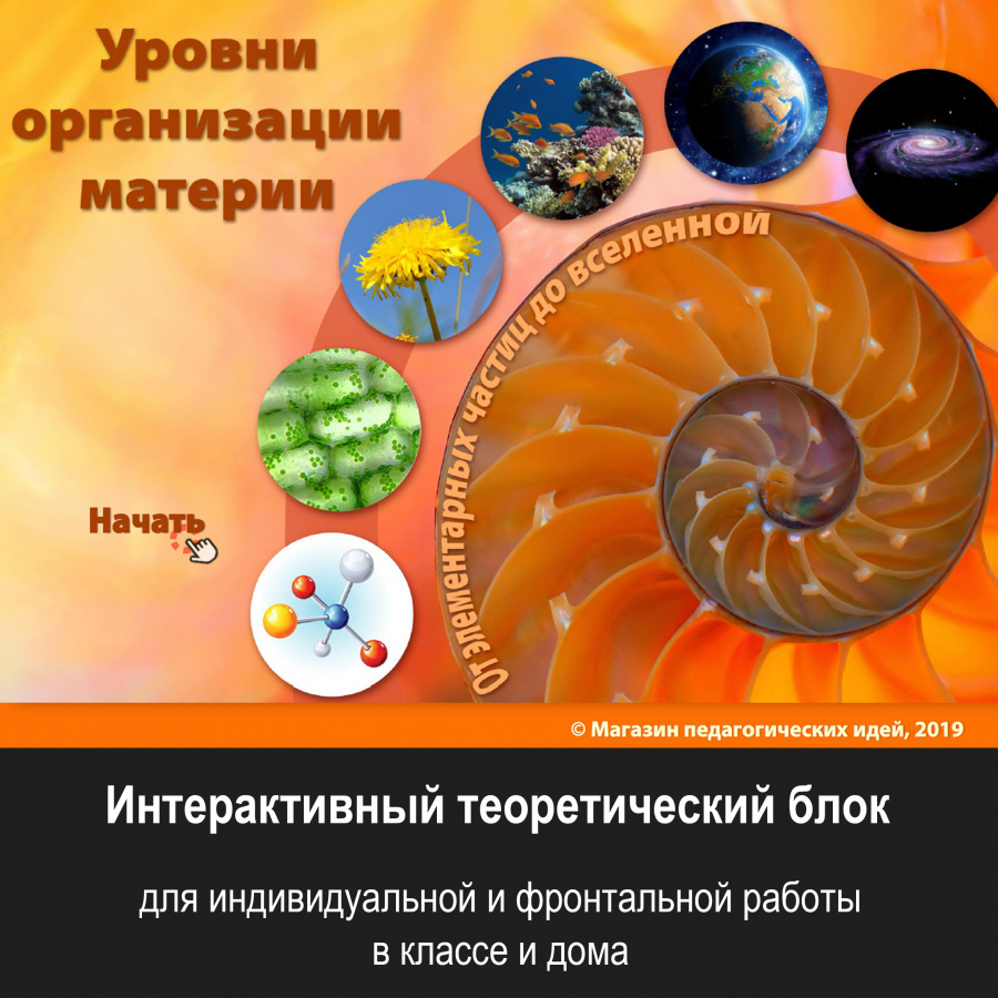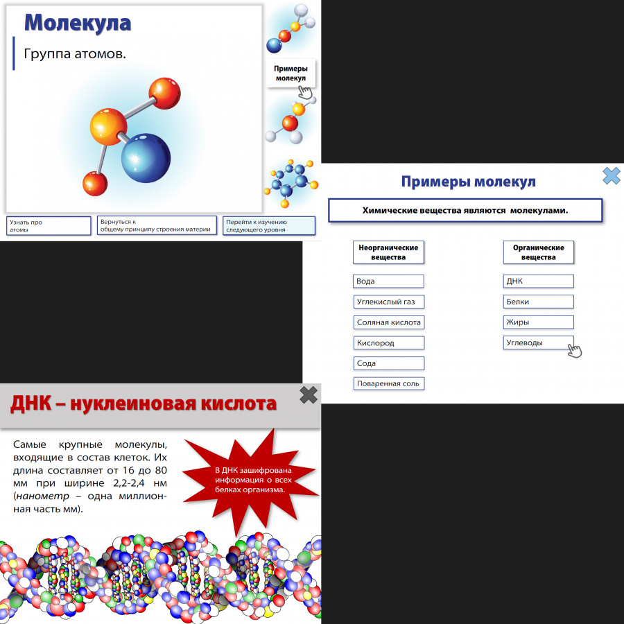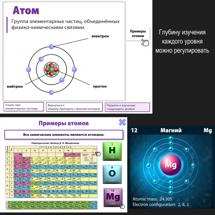 Интерактивная презентация с информацией о каждом уровне организации материи для изучения на разных уровнях сложности