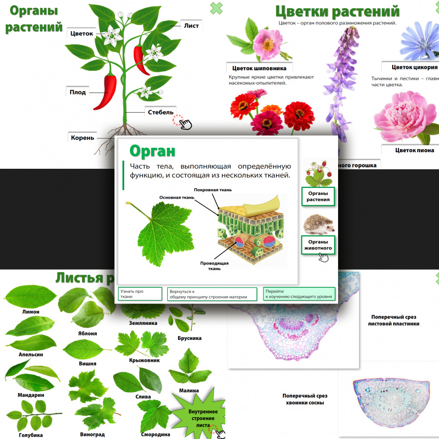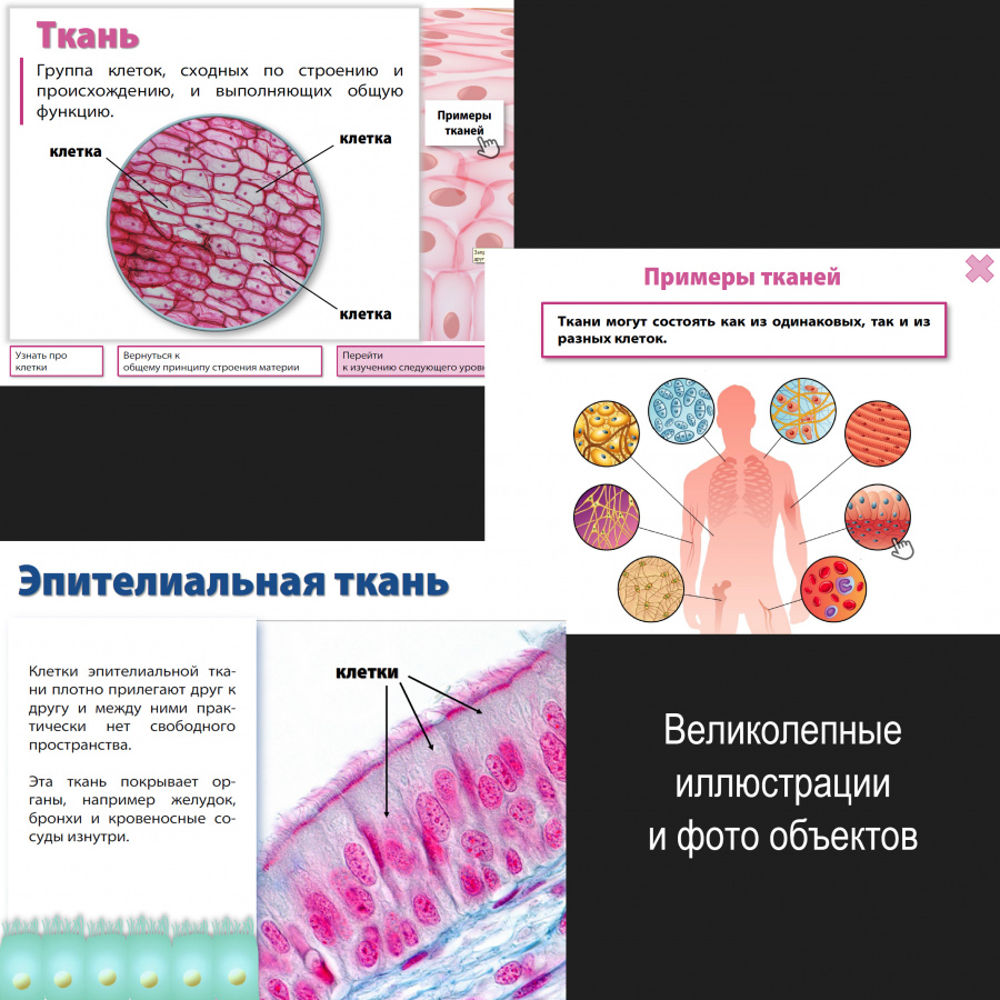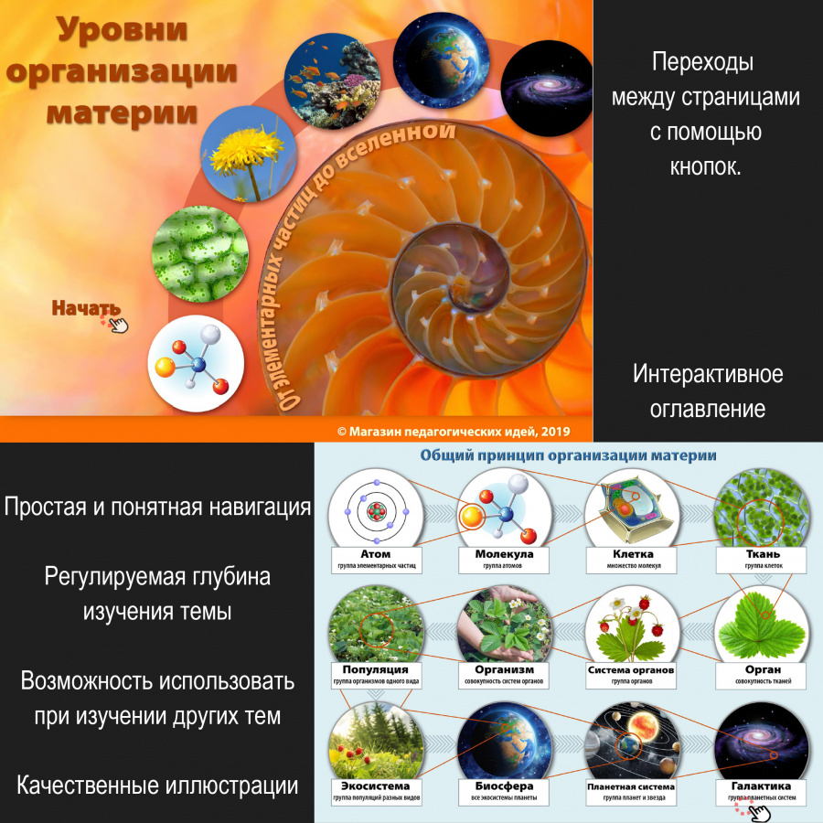Интерактивные переходы между уровнями, примерами и дополнительными подробностями, а также инфографика "Общий принцип организации материи" в качестве оглавления делают использование пособия понятным и простым.