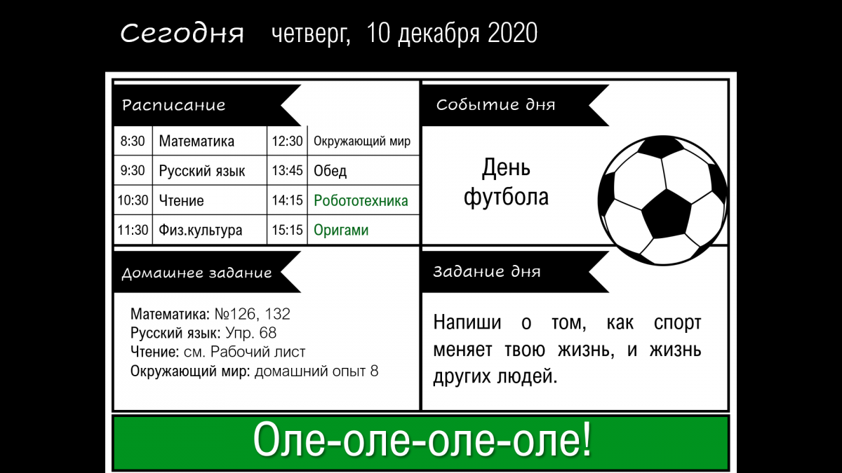 Вы можете использовать их как средство организации деятельности на весь учебный день или один урок, использовать как шаблон обычной учебной презентации или сохранять как PDF и рассылать своим ученикам на дистанционном обучении - возможностей использования масса.