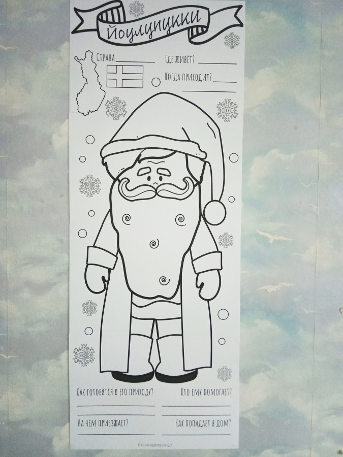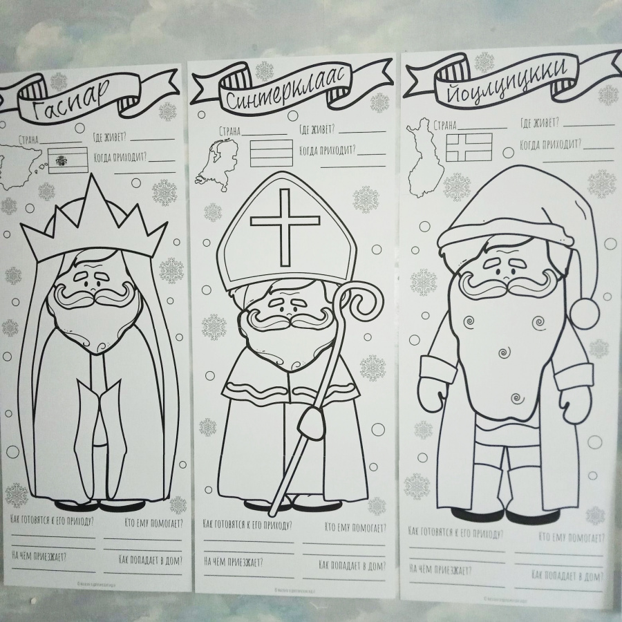 Готовые постеры можно повесить на стену в классе, коридоре или рекреации. Дополните галерею надписью "Деды Морозы со всего света" (входит в комплект).