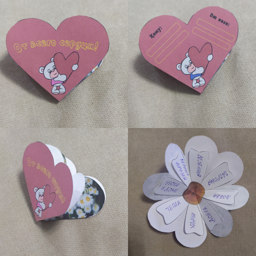 В комплект входит шаблон валентинки и детали ромашки в двух вариантах: цветном и чёрно-белом. Схема сборки довольно проста, что позволяет справиться с работой даже первокласснику.