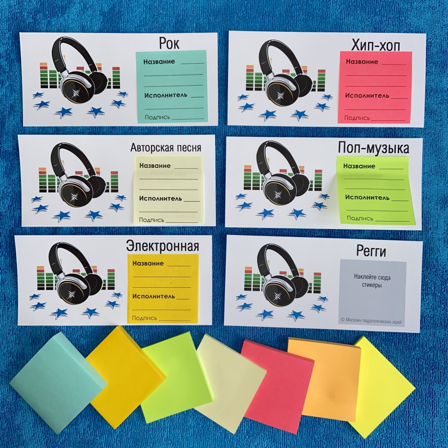 - Карточки для наклеивания блоков стикеров по жанрам/вариантам ответов