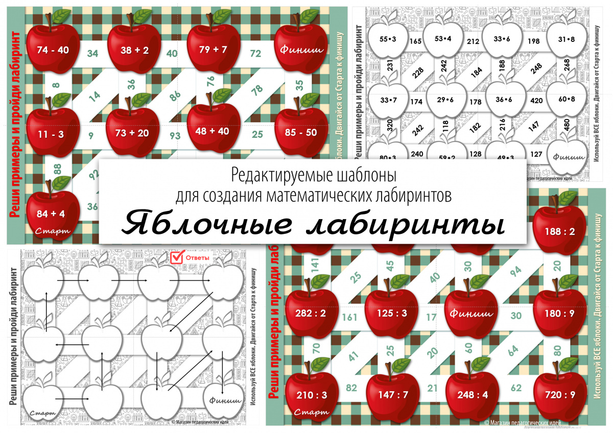 Каждый лабиринт данного комплекта состоит из соединенных в сеть яблок. Всего 25 вариантов. На яблоках – примеры, которые ребенку нужно решить, а на плоскостях, соединяющих яблоки - различные варианты ответов. Лабиринт начинается с яблока с надписью «Старт». Решив пример на ней, ребенок выбирает ответ и проводит линию от примера через ответ к следующему яблоку, и так продолжает до яблока «Финиш».