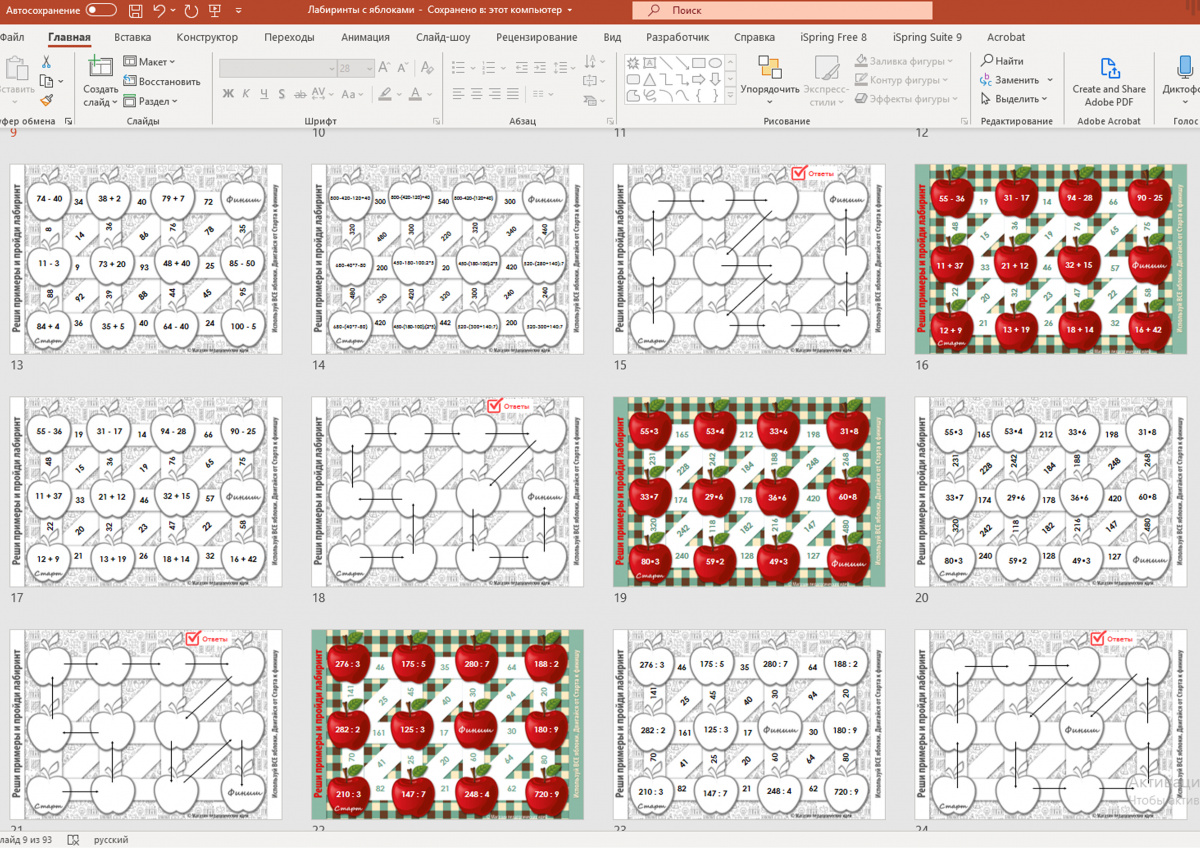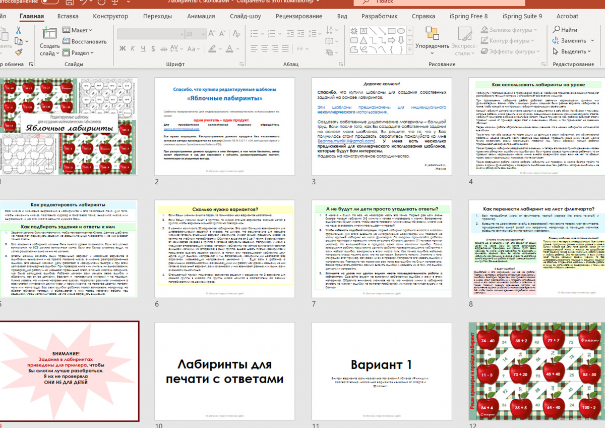 Шаблон включает в себя 25 вариантов цветных и 25 вариантов черно-белых лабиринтов в яблочной тематике, а также 25 лабиринтов с указателями движения по лабиринту.