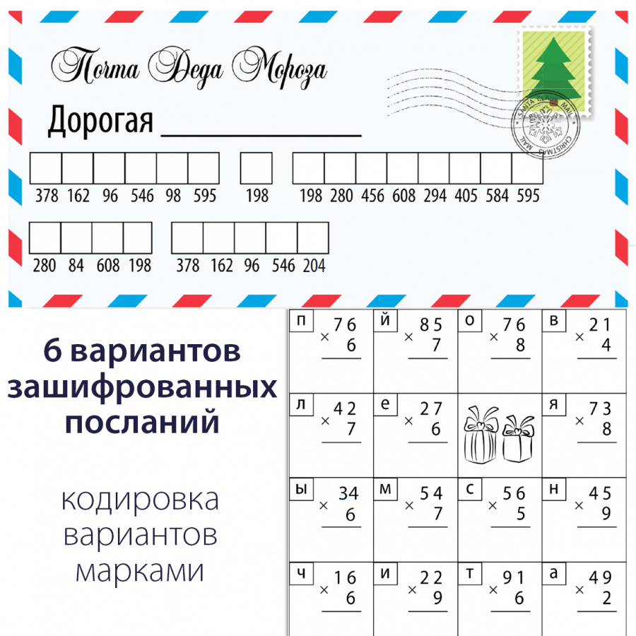 Дед Мороз отправил каждому ученику класса зашифрованное послание. Эти письма ждали, когда же ребята придут в класс. И вот, наконец! Каждый может решить примеры и расшифровать, что же Дед Мороз хочет сообщить ему в новом году.